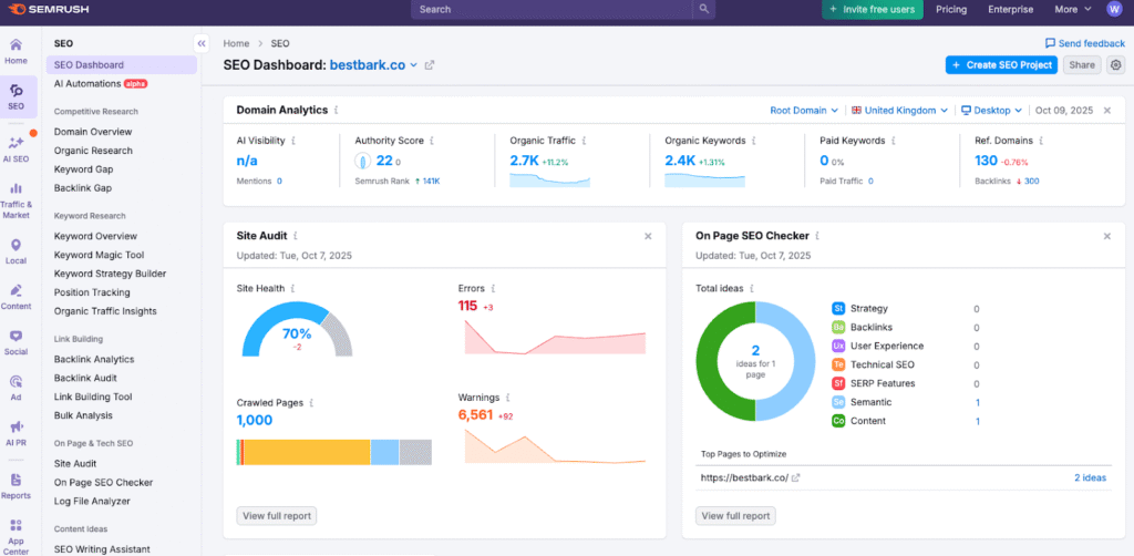- Site Audit – Identifies technical SEO issues before they become ranking problems.